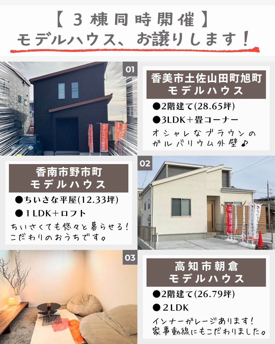 【3棟同時!】香美市土佐山田町旭町・香南市野市町・高知市朝倉モデルハウス内覧即売会!(1/17~2/1)