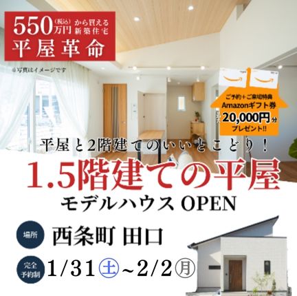 【東広島市西条町田口】「1.5階建て」新モデルハウスOPEN!(1/24~26)