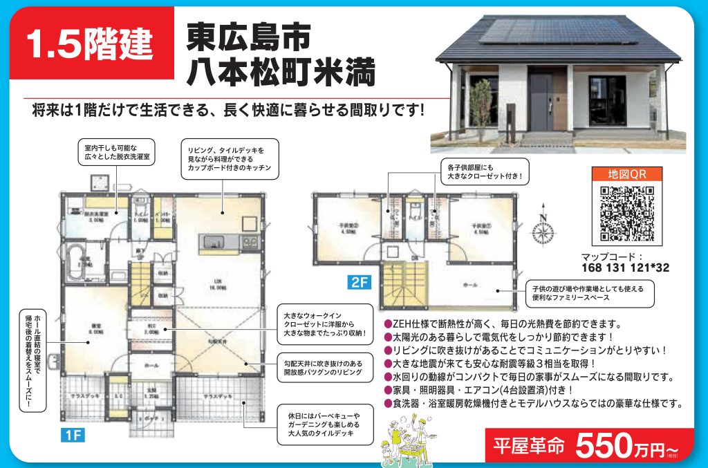 将来のライフスタイルの変化を見据えた「平屋ベース」の暮らしに、プラスアルファのゆとりを加えた「1.5階建て」のモデルハウスが、東広島市八本松町米満に登場しました。