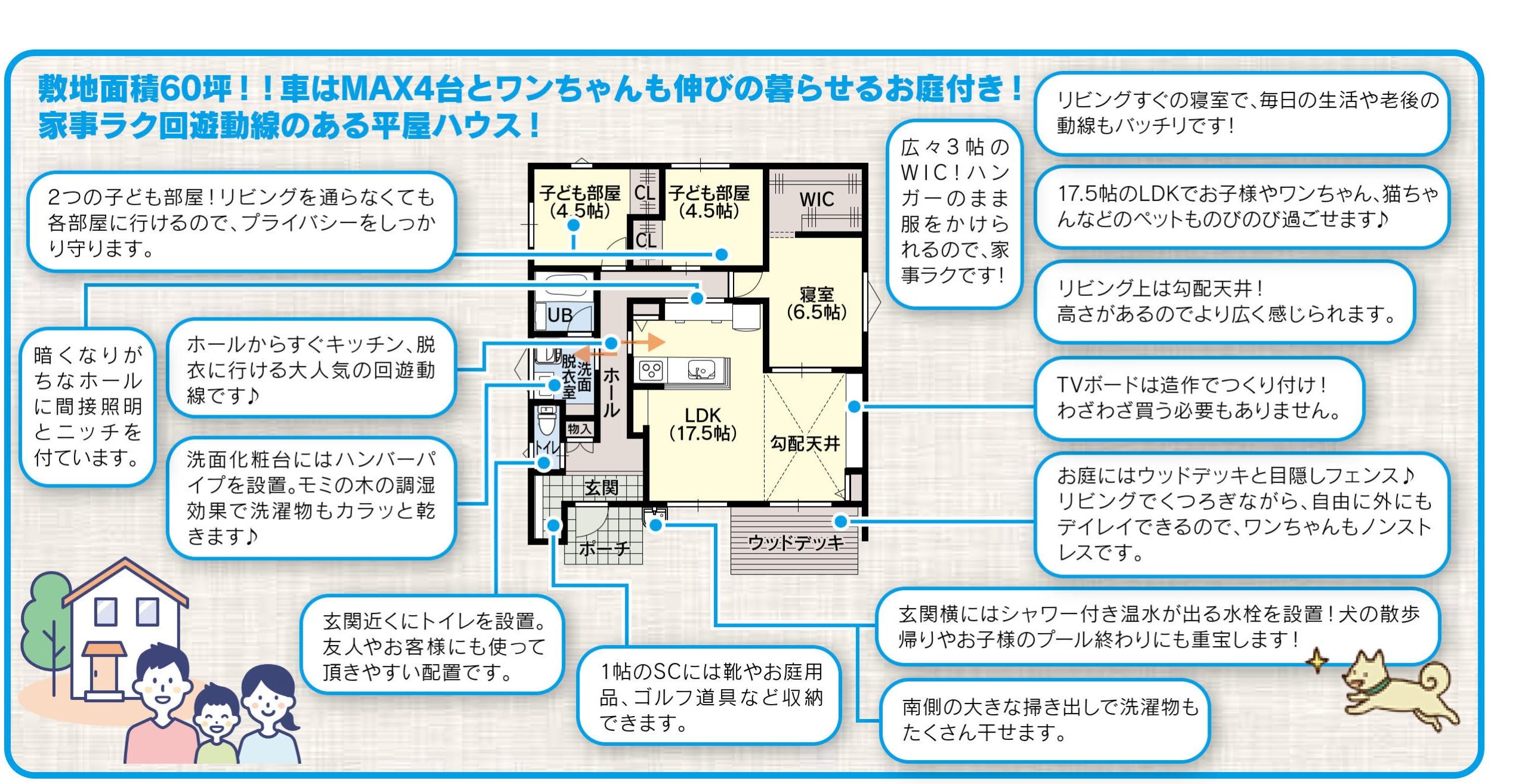 お庭が広く、ウッドデッキもあるので、わんちゃんものびのびと暮らせる間取りです。