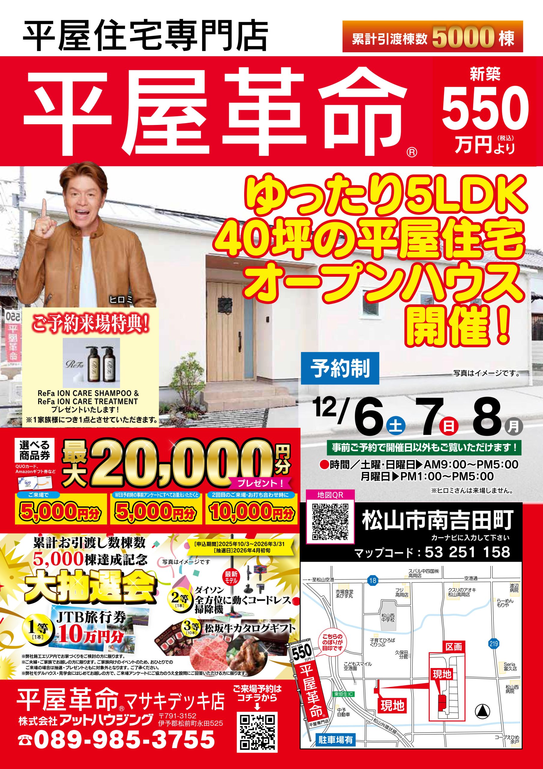 【松山市南吉田町】5LDK平屋完成見学会!(12/6~8、13~15)※マサキデッキ店
