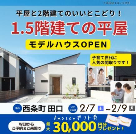 【東広島市西条町田口】「1.5階建て」モデルハウスOPEN!(2/7~9)