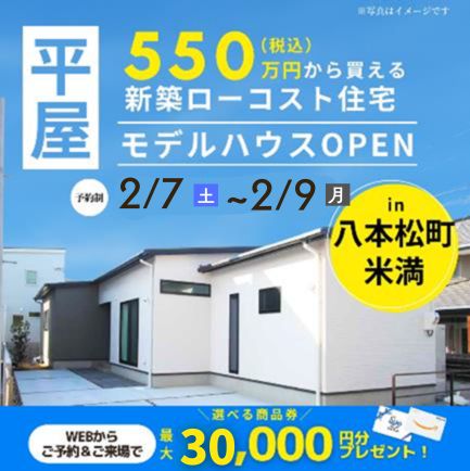 【東広島市八本松町米満】「平屋」モデルハウスオープン!(2/7~9)